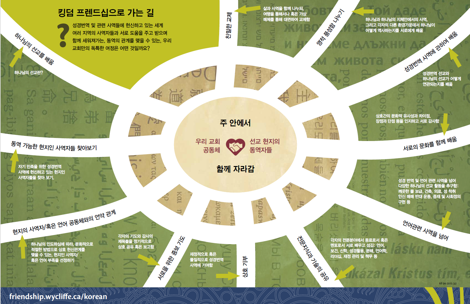 위클리프 캐나다는 지난 2012년부터 킹덤프렌드십이라는 선교신학적 이해를 바탕으로, 캐나다에 있는 교회와 성경번역 선교 현장의 소수민족이 연결되어 하나님 나라를 위하여 교제하고 동역하며 함께 주님 안에서 자라가는 모델을 추구하고 있습니다