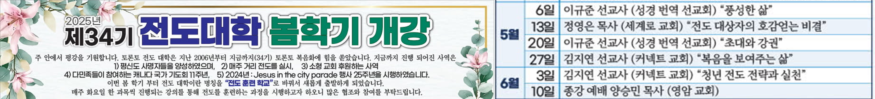 두 차례에 걸쳐 토론토 전도대학에서 선교 메시지의 핵심 내용이 되는 천국복음 (마 24:14)에 대한 이야기와 관계 속에서 하나님의 행하심을 믿고 나누는 복음 이야기에 대해 전했습니다. 기존교회와 성도들이 세속화되고 혼합주의적인 신앙을 갖고 있는 것을 잘 모를 때가 많은데, 지난 3월에 있었던 토론토 선교대회에서 크리스토퍼 라이트의 고백처럼 서구교회야말로 가장 혼합주의적인 신앙을 가진 교회라는 말처럼, 서구교회에서 기독교를 전수받은 한국교회 역시 그런 것을 간과할 때가 많습니다. 말씀 그대로, 주님이 이 땅에 오셔서 보여주신 그대로의 '복된' 천국의 메시지가 바로 전해져야 합니다.