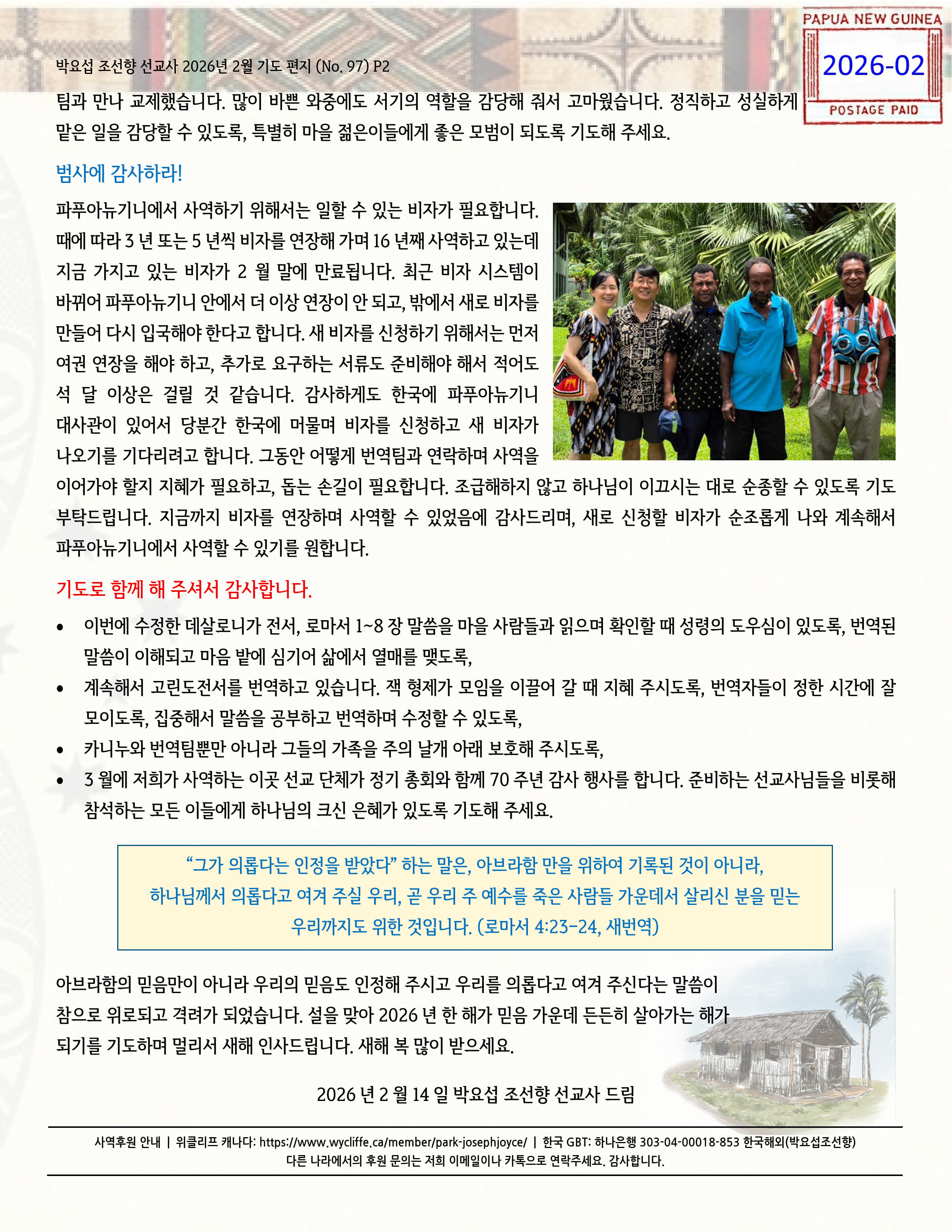 한인 선교사 사역 소식 및 기도 제목 제목(26.02) 박요섭/조선향 선교사 사역 소식 및 기도제목2026-02-14 14:54작성자이규준첨부파일2026-02 Parks Newsletter_1.jpg (818KB)2026-02 Parks Newsletter_2.jpg (865KB) 목록 댓글 [0] 더보기이전이규준/한진숙 선교사 소개이규준2023-04-05다음(25.12) 이규준/한진숙 선교사 사역 업데이트 및 기도제목이규준2025-12-24 Powered by MangBoard | 망보드 스토어