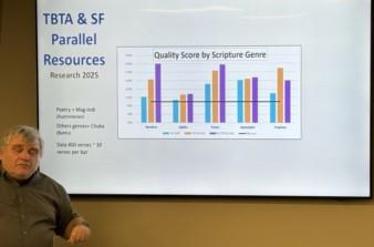 [Left: David Duncan, team lead of TBTA, The Bible Translator's Assistant, showed a research data, the best result of national translators' drafting of Scripture by using TBTA and Scripture Forge together as references, not as direct drafts. Right: Participants of The Unfinished Story held at Langley Grace Church]