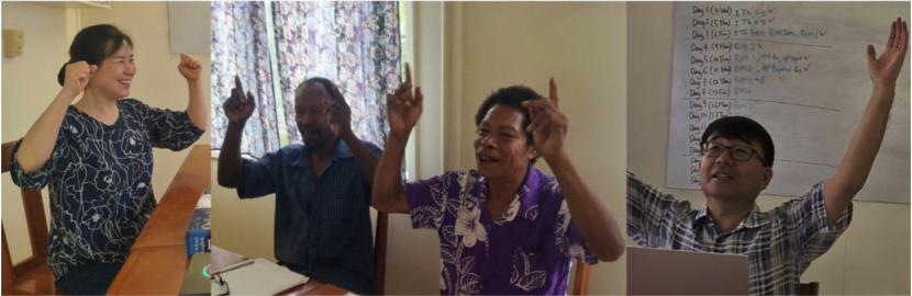 Hallelujah! We give thanks to the Lord that the Kaninuwa Bible translation work continues even during the hottest summer months in the southern hemisphere! Over the past few weeks, Kaninuwa Bible translation workers Levi and Simon visited the Alotau Centre and completed the team review of 1 Thessalonians and Romans 1-8. To experience the message of always rejoicing and giving thanks, they began each review session with body worship. Now that this word is being reviewed in the Sibesibe village, please pray that many Kaninuwa people will taste a life of constant joy and gratitude, rooted in God's unbreakable love, the assurance of faith, and hope, as revealed in Romans 1-8.