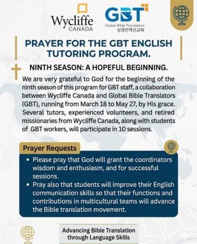 감사하게도, 한국성경번역선교회(GBT) 사역자들의 영어 능력 향상을 위한 튜터링 프로그램 9기가 오는 3월 18일부터 5월 27일까지 진행됩니다. 위클리프 캐나다의 자원봉사자들과 은퇴 선교사들로 구성된 여러 명의 교사들, GBT 사역자들이 총 10번의 세션을 갖게 됩니다.